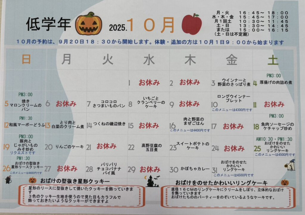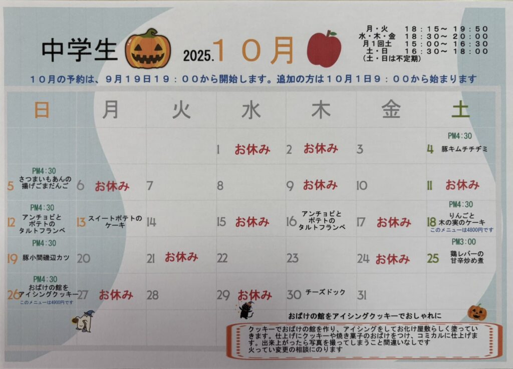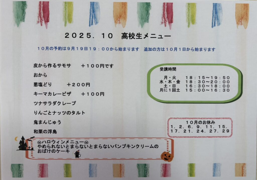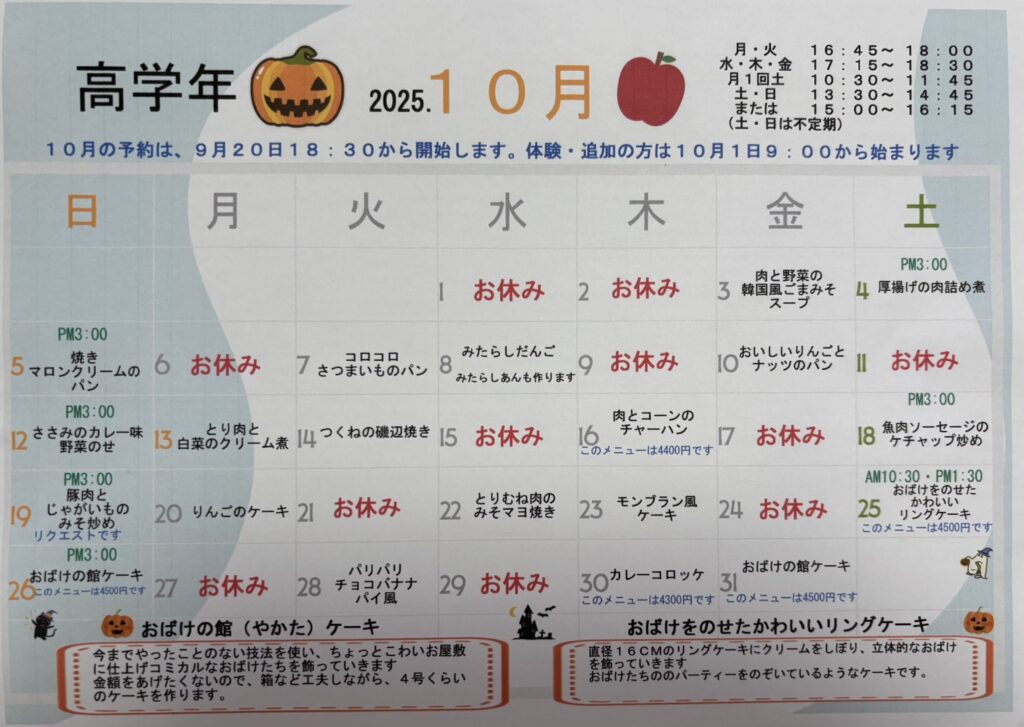 持ち物 | エプロン、三角巾、ハンカチ、 タッパー(1800ccくらいの容量 のあるものがベストです) タッパーを入れるビニール袋 保冷剤・保冷バック、体験料 |